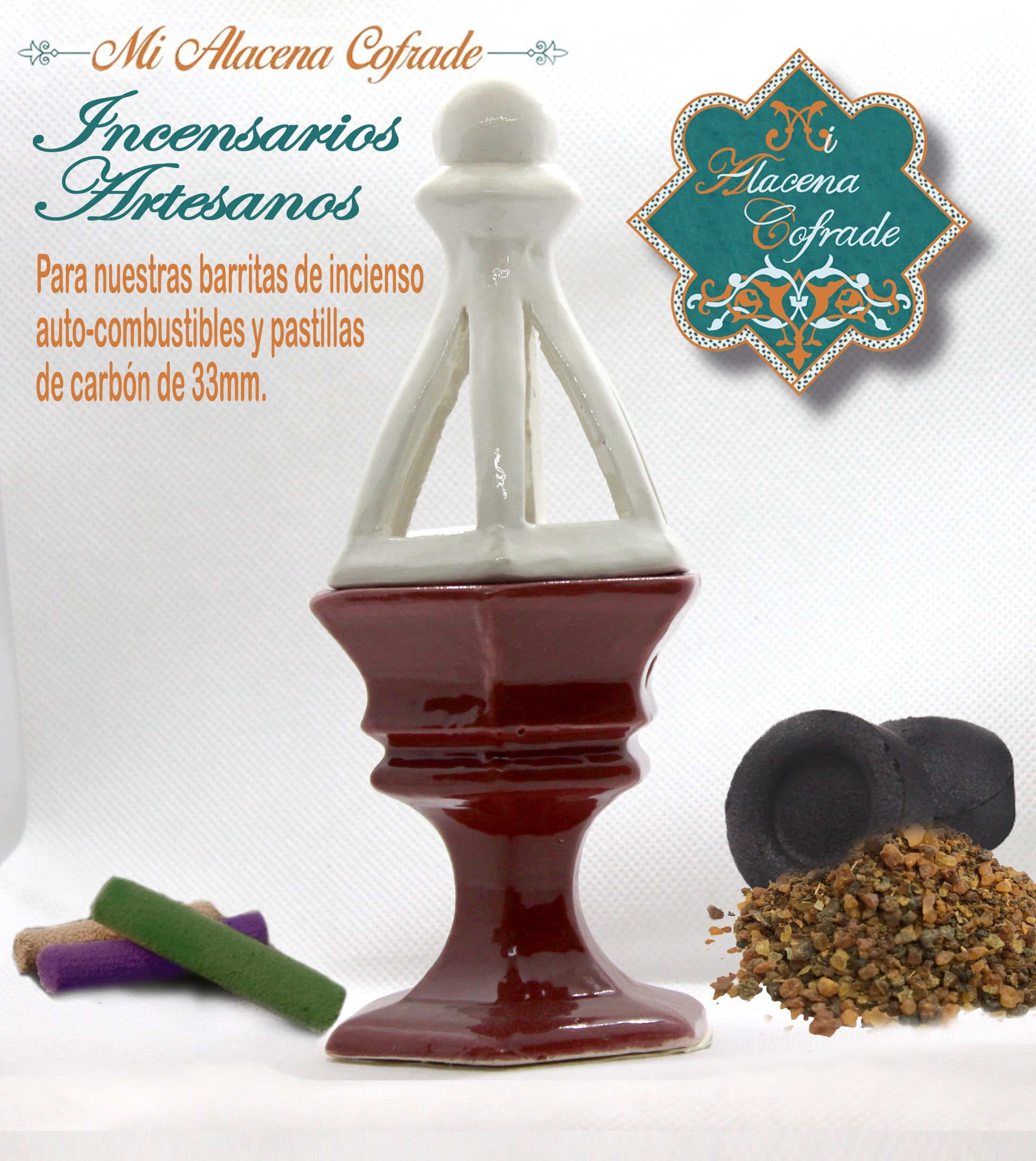 Incensario artesanal cerámica Burdeos y Blanco.