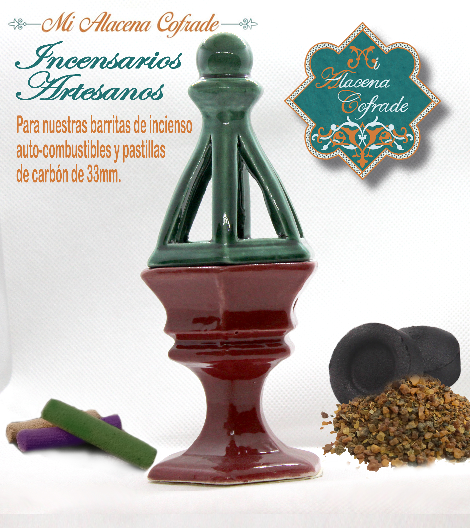 Incensario artesanal cerámica Burdeos y Verde.