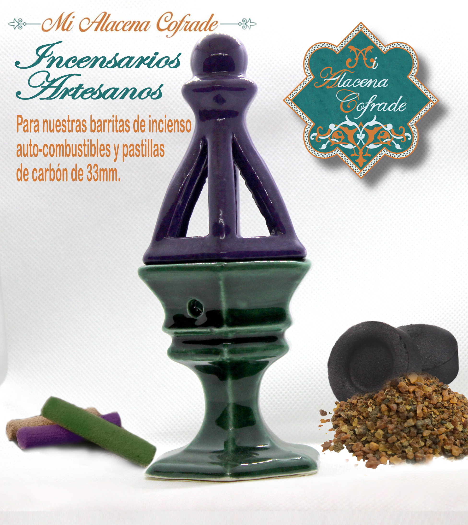 Incensario artesanal cerámica Verde Oscuro y Morado.