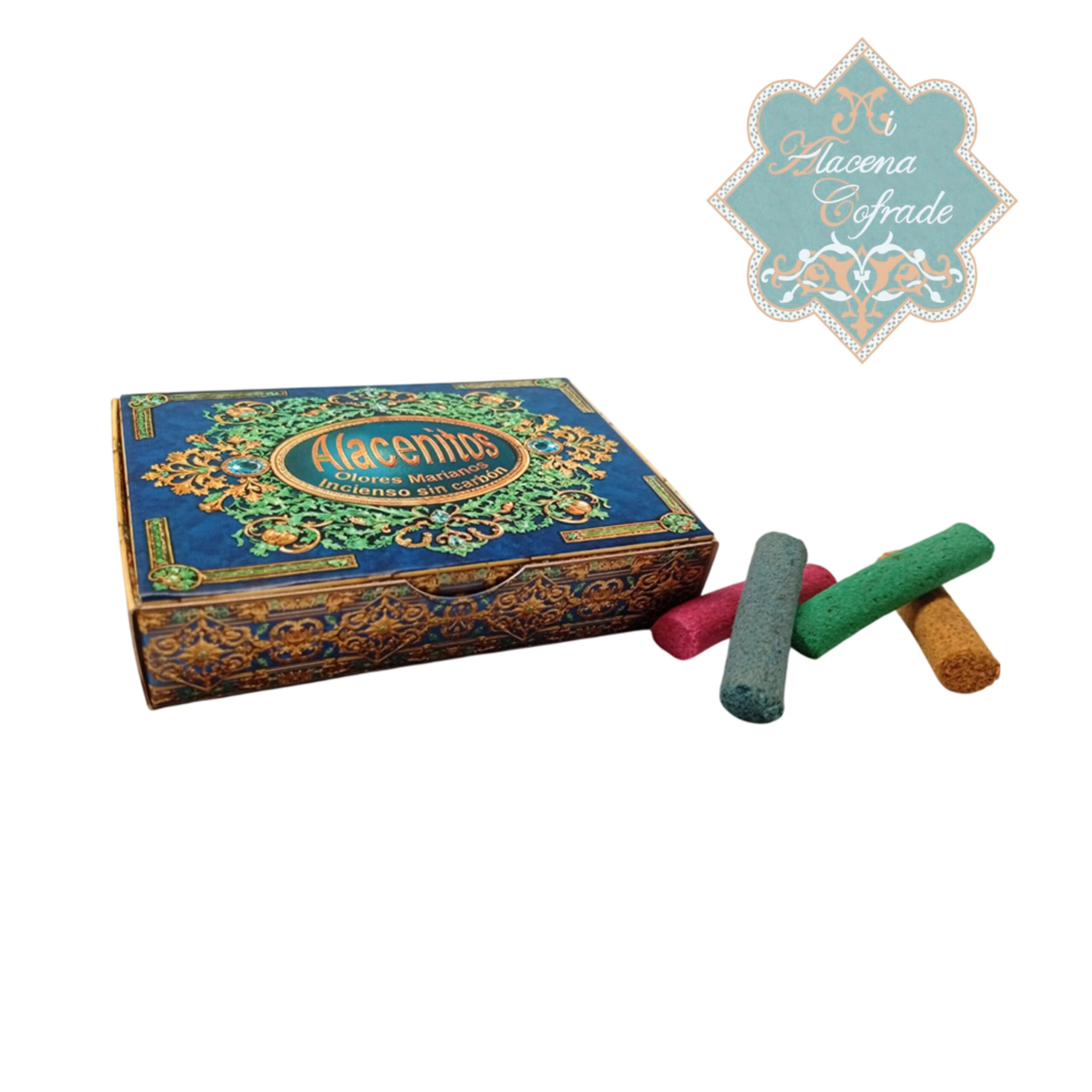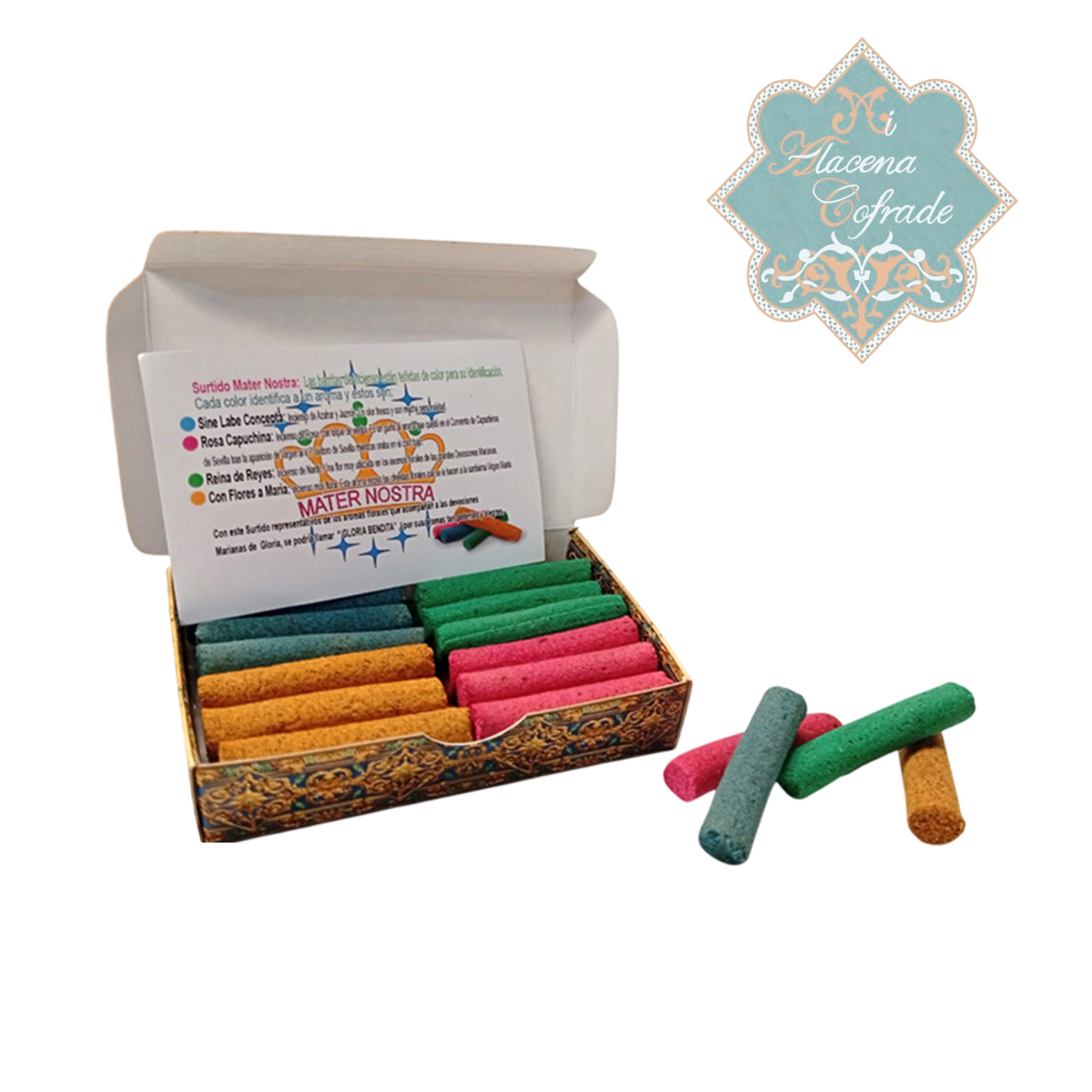 TIPOS DE INCIENSOS: Las barritas de incienso están bañadas completamente de su color, asimilándose a los cirios de los tramos de nazarenos de las cofradías.